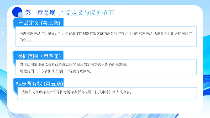 地理标志产品“达濠鱼丸”:指在濠江区现辖行政区域内质量特征符合《地理标志产品 达濠鱼丸》地方标准规定的鱼丸。