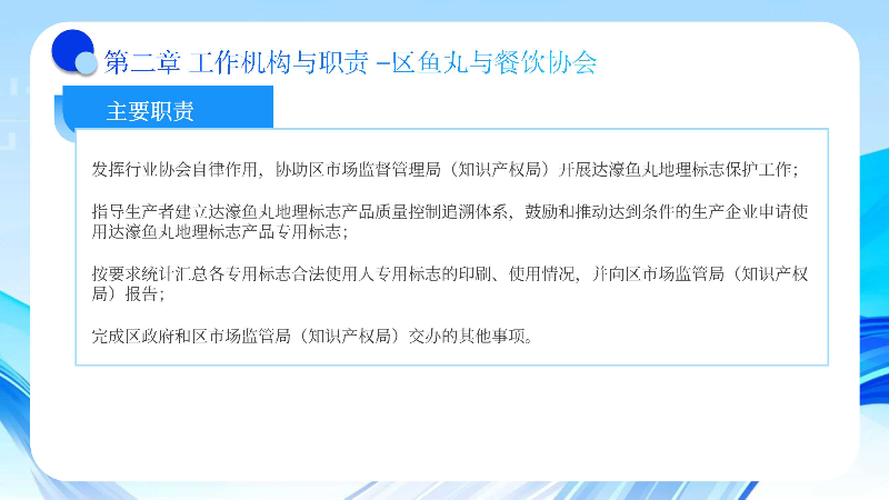 1.发挥行业协会自律作用,协助区市场监督管理局(知识产权局)开展达濠鱼丸地理标志保护工作;
