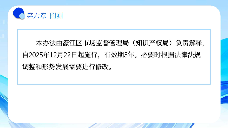 本办法由濠江区市场监督管理局(知识产权局)负责解释,自2025年12月22日起施行,有效期5年。必要时根据法律法规调整和形势发展需要进行