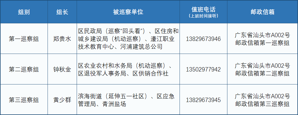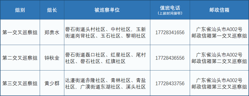 监督邮政信箱:广东省汕头市A002号区委巡察办