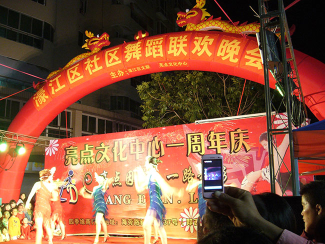 10月26日,濠江花园步行街华灯璀璨,人潮涌动,充满欢声笑语。为迎接十八大,活跃群众文化生活,推动舞蹈事业的发展,濠江区文联和亮点文化中心联合在这里举行濠江区社区联欢舞蹈晚会暨亮点文化中心成立周年庆典。区委宣传部、区文联有关领导参加了活动并致词,希望我区要同时推动群众性广场舞蹈活动的广泛开展及专业性舞蹈、适合舞台表演舞蹈的逐步开展,丰富城乡群众文化生活。亮点文化中心的创办人介绍了该中心的办学情况和取得的优异成绩。