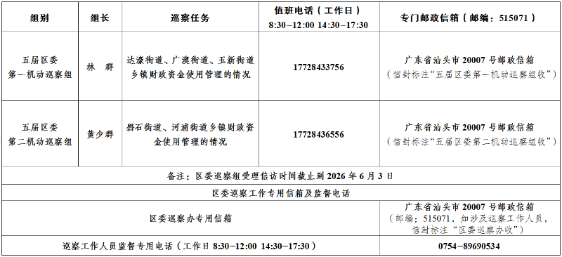 根据巡视巡察有关工作要求,经区委巡察工作领导小组研究并报区委同意,现对濠江区乡镇财政资金使用管理机动巡察工作任务调整如下:区委第一机动巡察组负责对达濠街道、广澳街道、玉新街道乡镇财政资金使用管理情况进行巡察;区委第二机动巡察组负责对礐石街道、河浦街道乡镇财政资金使用管理情况进行巡察,巡察时间截至2026年6月上旬。