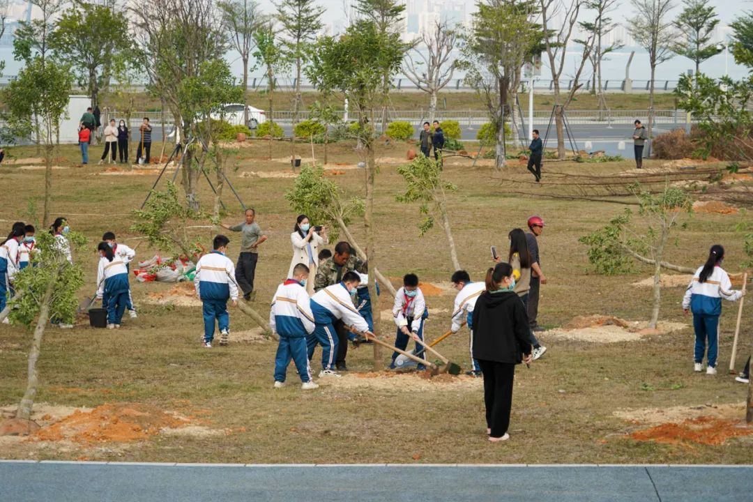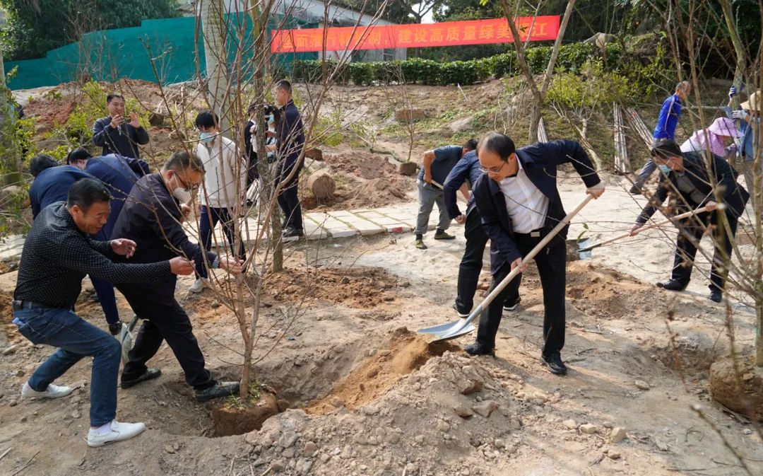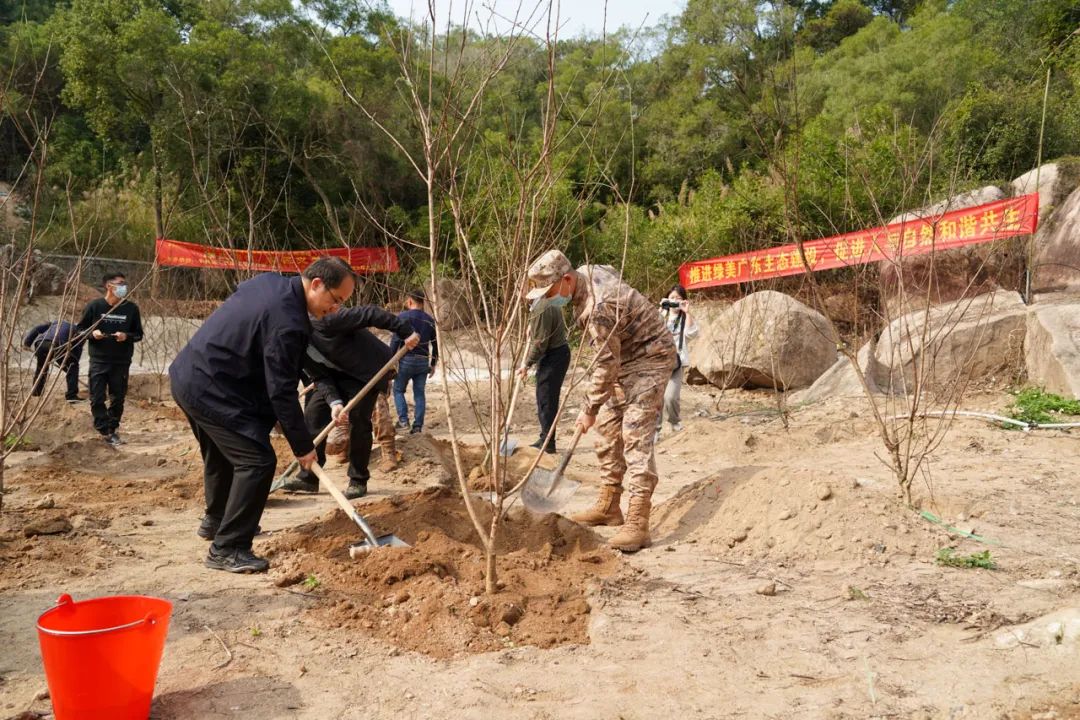 在区领导的带领下,在场部队官兵、干部群众干劲十足、配合默契,大家挥锹铲土、培土围堰、提水浇灌,种植了碧桃、银叶合欢、黄花风铃木、菩提等观花彩叶树种约300余株,为春天的濠江增添了一抹新绿。