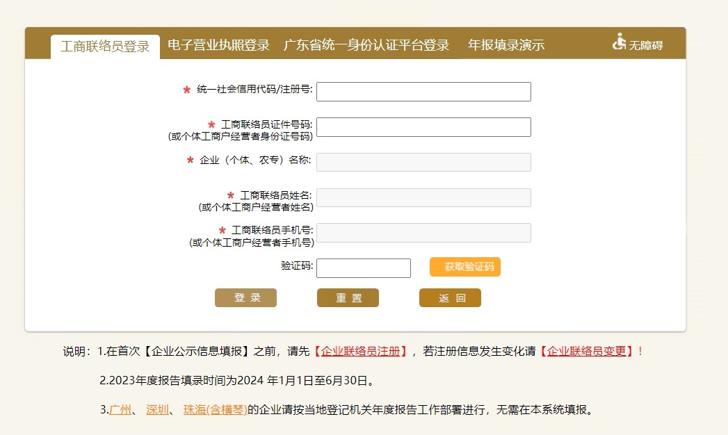 注:在首次【企业公示信息填报】之前,请先【企业联络员注册】,若注册信息发生变化请【企业联络员变更】。