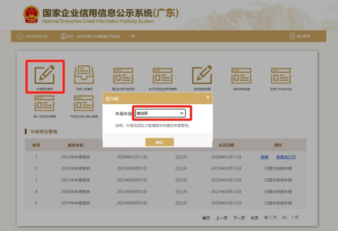 注:如果往年年报未报送,须先补录往年年报后方可填报本年度年报。