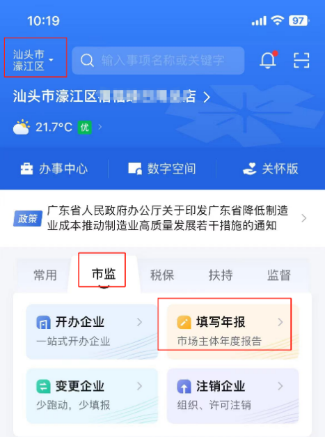 2、进入年报系统。点击首页左上角位置信息,选择年报经营主体所在城市,点击【市监】-【填写年报】-【年度报告填写】,完成人脸识别验证,即可进入年报系统。