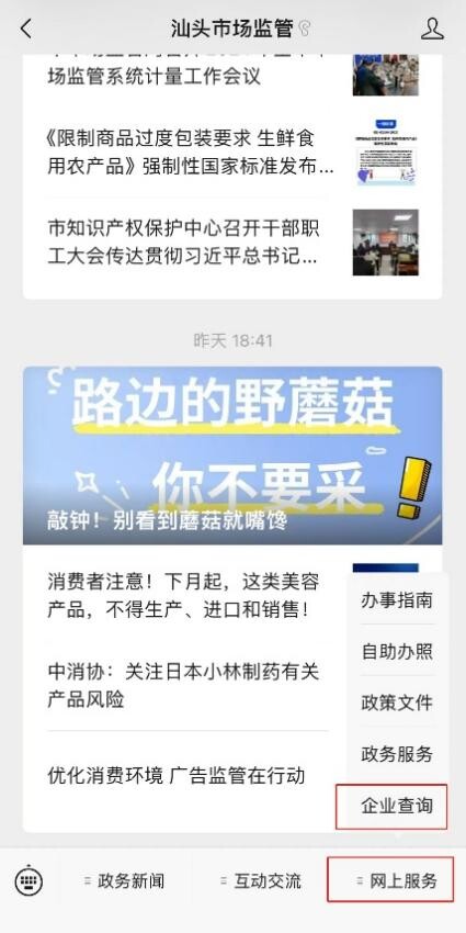 关注“汕头市场监管”微信公众号,点击底部菜单栏【网上服务】,选择子菜单【企业查询】,即可跳转到“国家企业信用信息公示系统”进行自助填报。