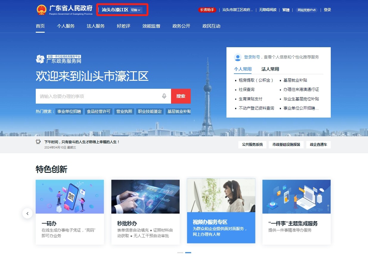 一、通过电脑登录广东政务服务网汕头市濠江分厅“视频办服务专区”。电脑端访问网址:https://www.gdzwfw.gov.cn/?region=440512