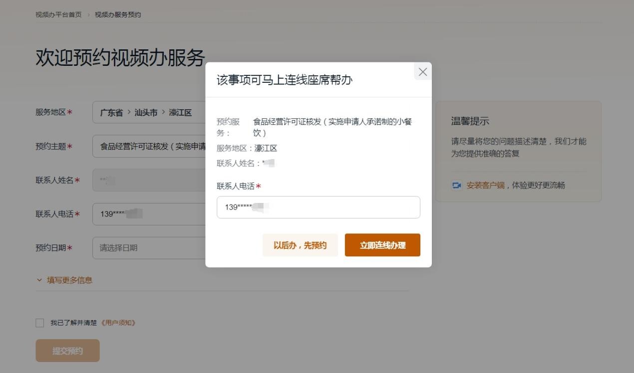 选择“以后办,先预约”方式的,及时查收预约成功的手机短信,并按约定时间在线报到。选择“立即连线办理”方式的,确认后等待客服叫号,转接视频咨询。为保证服务质量,可提前下载安装“视频办”客户端。如需查看当前预约,可点击“返回平台首页”。
