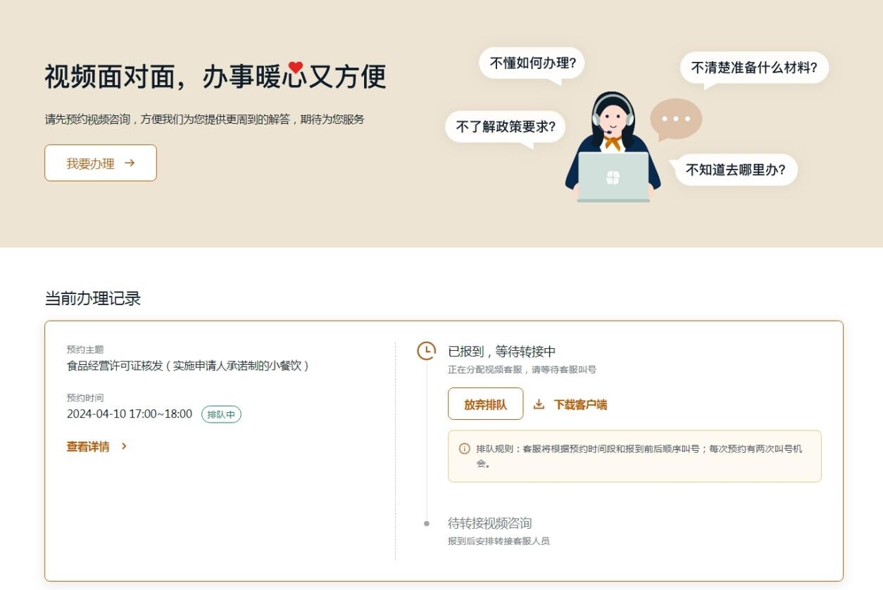 三、在预约服务时段开始前登录视频办服务专区,点击“立即报到”进行排队,等待客服人员叫号,到号后点击“连线客服”即可接入视频会话。
