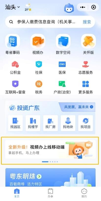 一、打开粤省事APP/小程序或粤商通APP,在首页点击“视频办服务专区”入口,进入专区。
