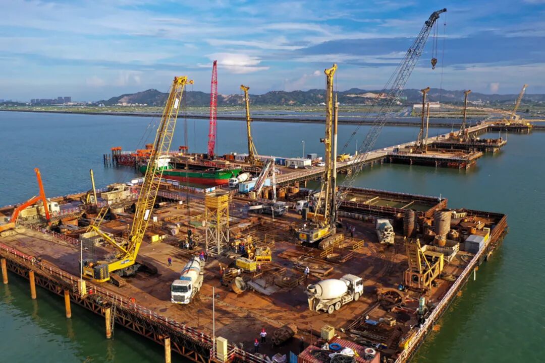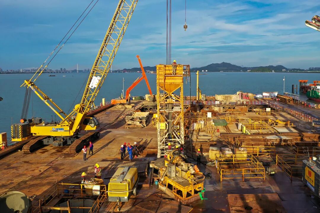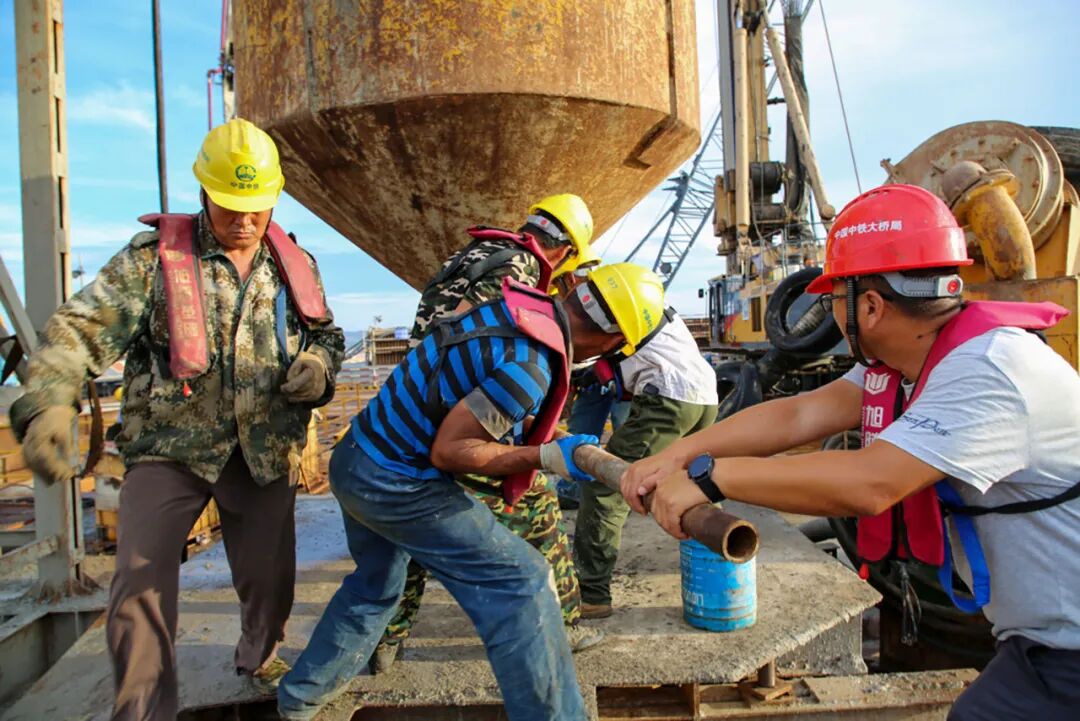 目前,由5万方高性能海工混凝土筑成的80根超长钻孔桩矗立在榕江水系100多米深的岩层上,就像80名钢铁卫士般牢牢地守护着牛田洋特大桥的安全,见证着大桥的成长。
